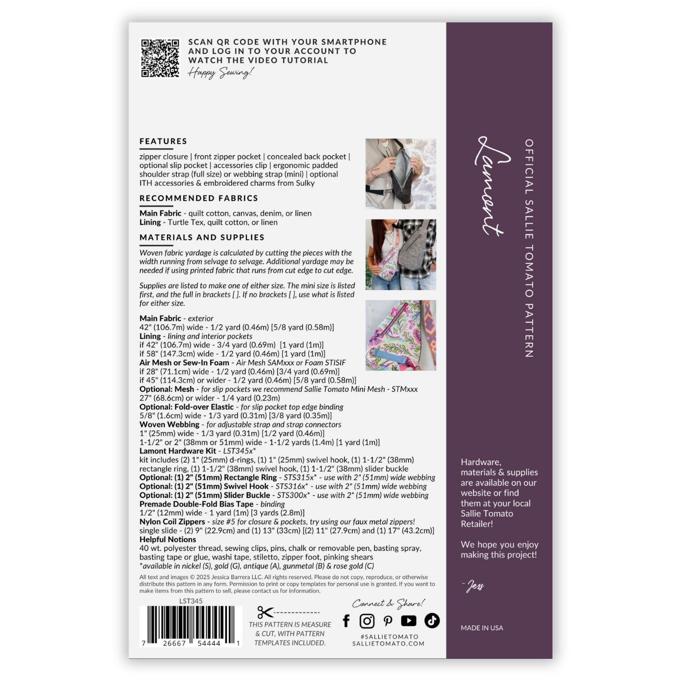 Sallie Tomato provides sewing patterns, purse hardware, handbag zippers, cork fabric, and select sewing supplies for bag making.