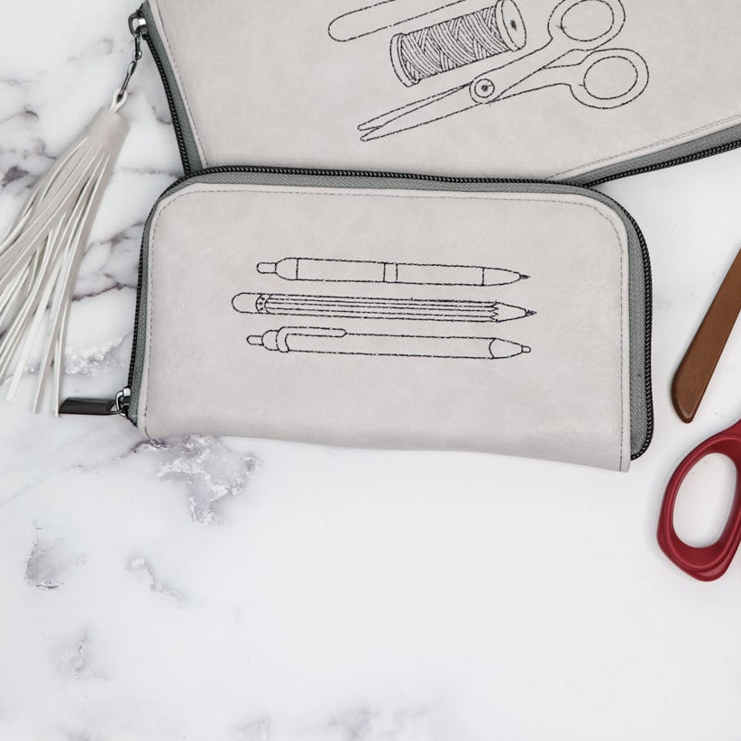 Esta muestra se creó a partir de nuestro patrón Wallet Deanie Beige Faux Leather. El tamaño de este bolso es de 4" de ancho, 7 1/2" de alto y 3/4" de profundidad. Las características de este bolso incluyen: Exterior limpio ideal para adornos, bolsillos interiores deslizantes, cierre de cremallera, tirador de cremallera con borla opcional.