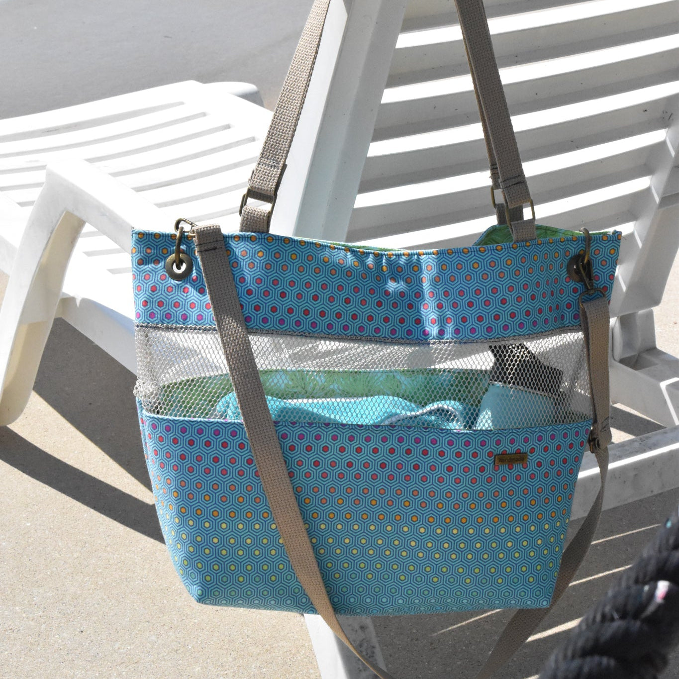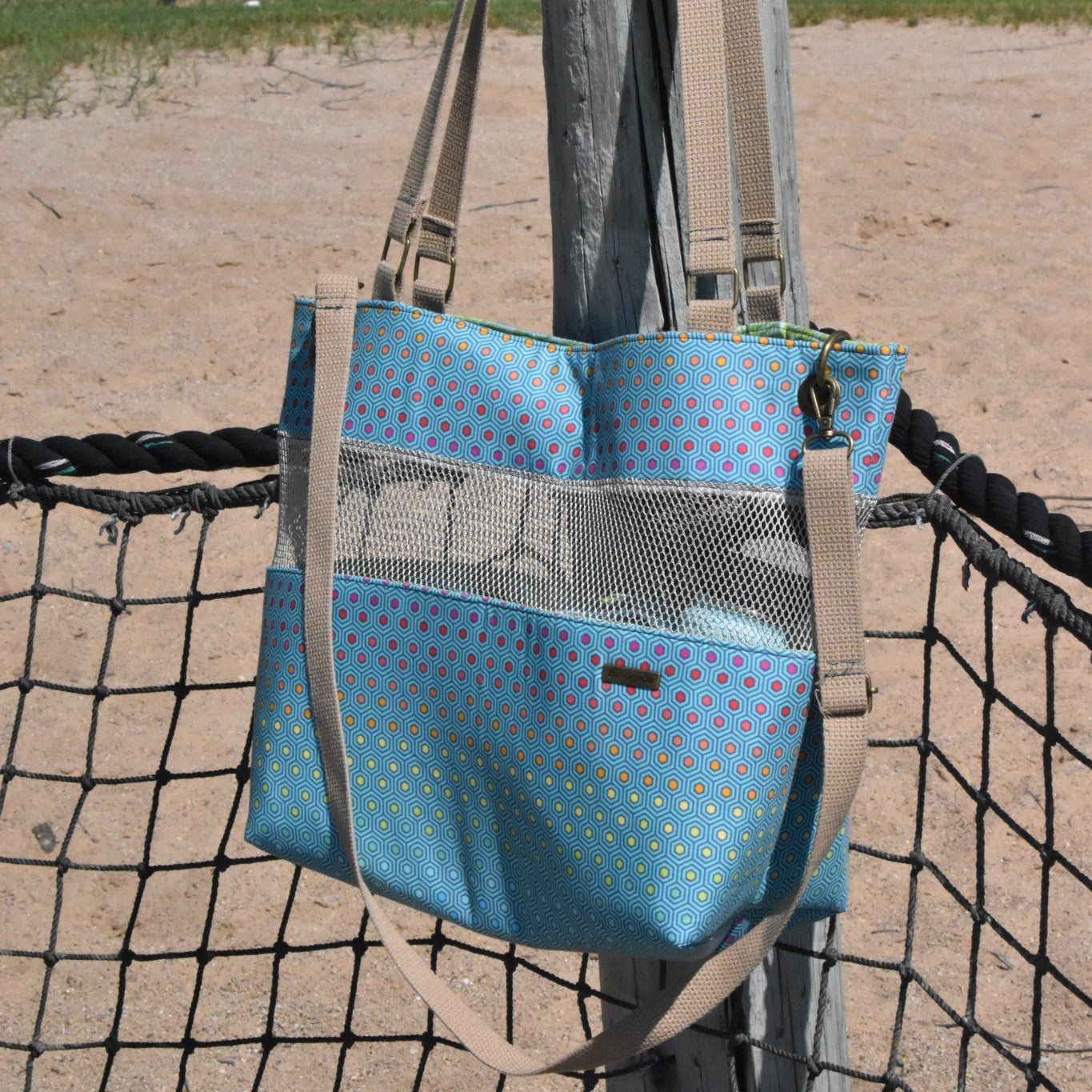 Esta muestra fue creada a partir de nuestro patrón de algodón laminado Malibu de Hudson Splash Fabrics. El tamaño de este bolso es 12" de ancho, 8" de alto y 8" de profundidad. Las características de este bolso incluyen: bolsillos delanteros y traseros, asas, bolsillos laterales con cierre de solapa, bolsillo con cremallera, cierre superior con cremallera, correa ajustable.