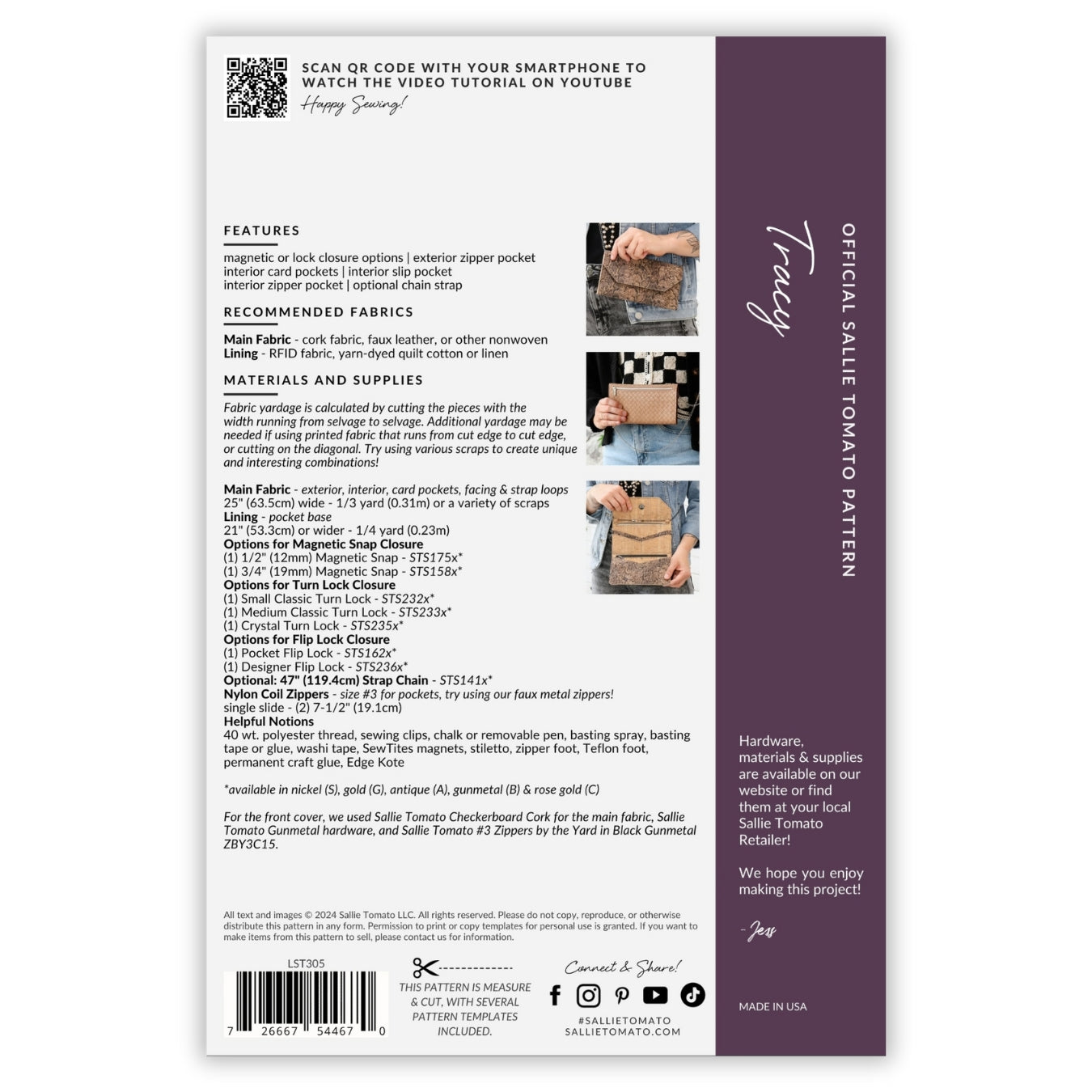 Sallie Tomato ofrece patrones de costura, herrajes para bolsos, cremalleras para bolsos, telas de corcho y artículos de costura selectos para la confección de bolsos.