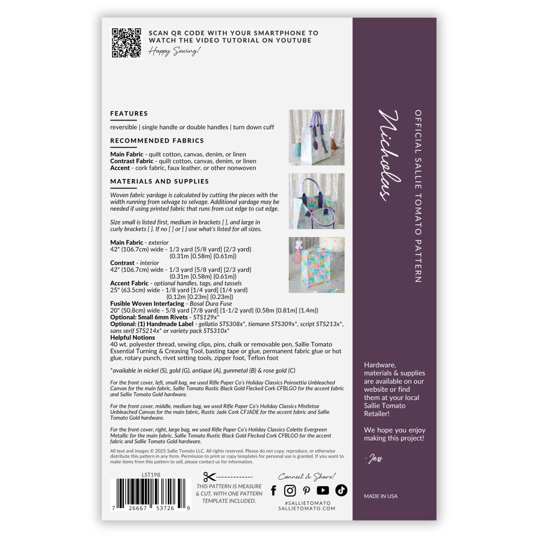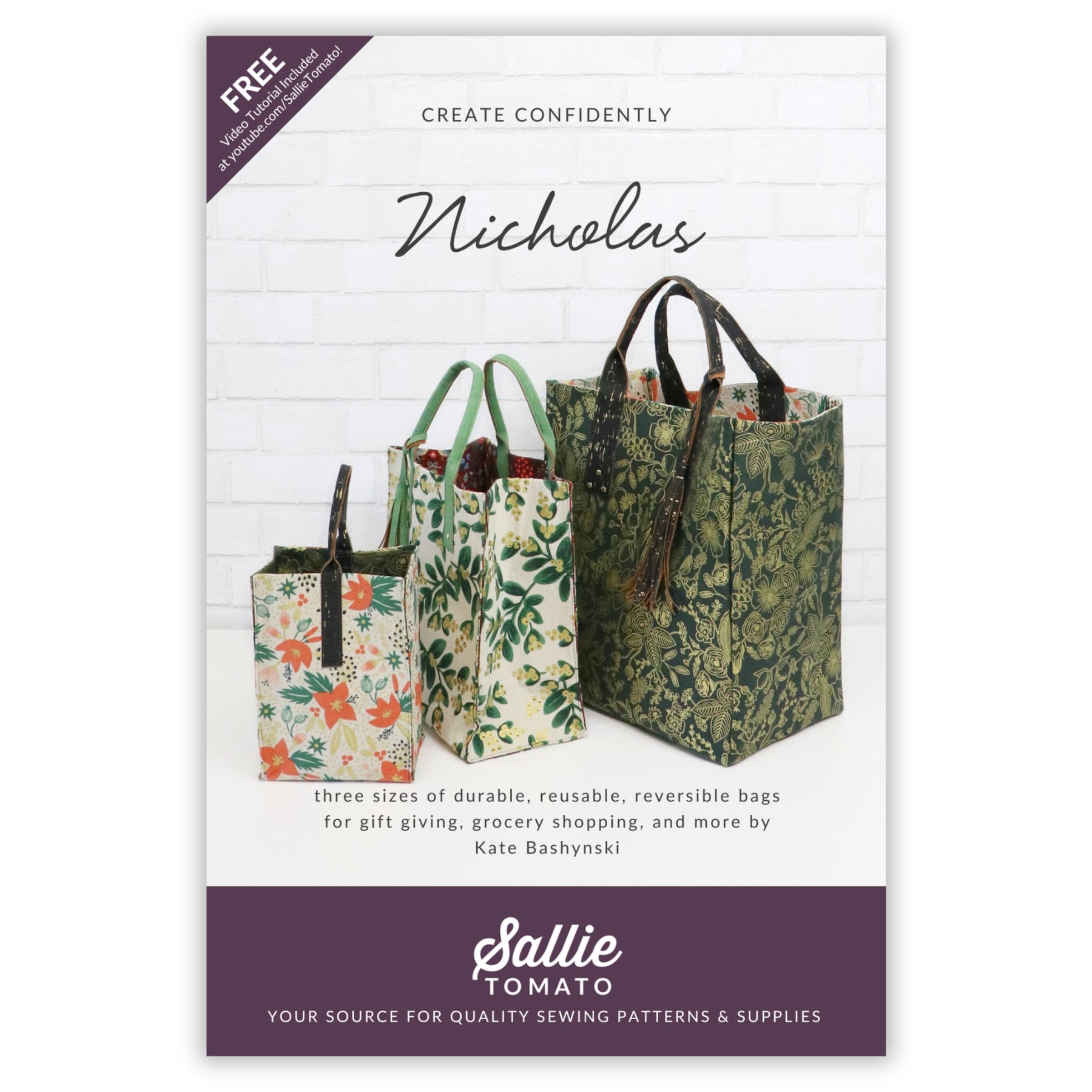 Sallie Tomato ofrece patrones de costura, herrajes para bolsos, cremalleras para bolsos, telas de corcho y artículos de costura selectos para la confección de bolsos.