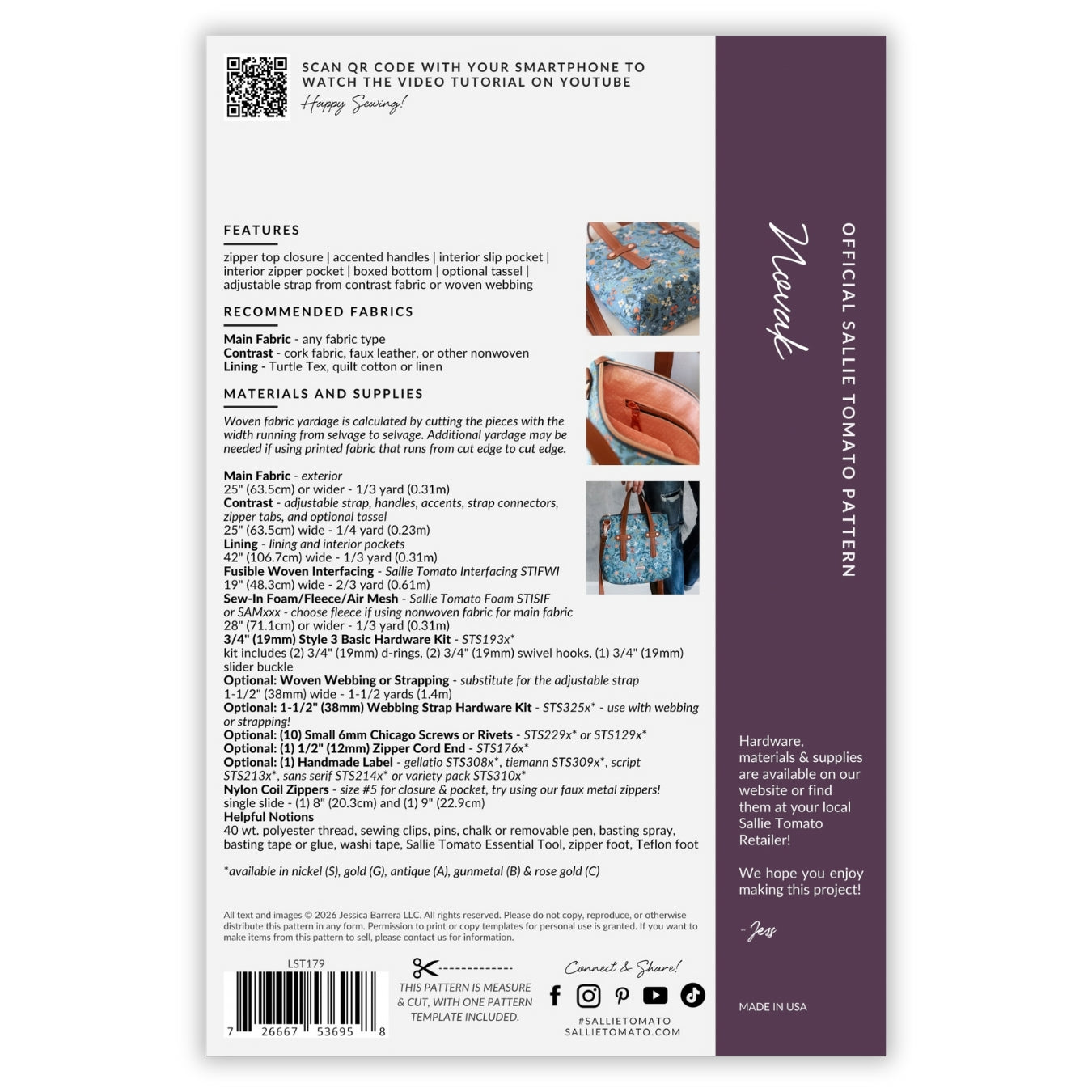 Sallie Tomato provides sewing patterns, purse hardware, handbag zippers, cork fabric, and select sewing supplies for bag making.