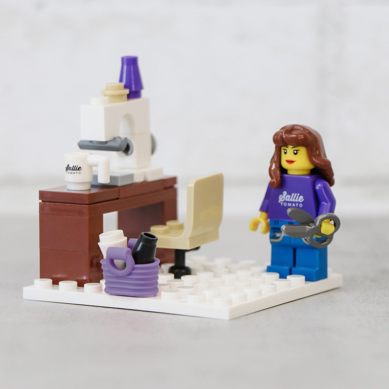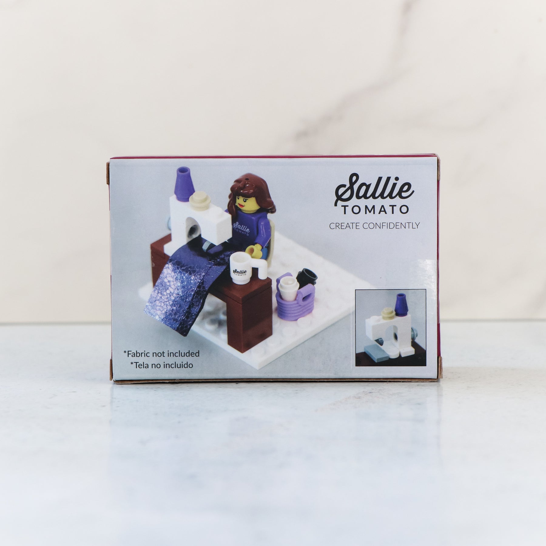 Inside, you’ll find 32 pieces that come together to create a charming sewing-room scene—complete with a sewing machine, work table, swivel chair, accessories, and a sewist figurine proudly wearing Sallie Tomato gear. Whether displayed on a shelf or enjoyed as an afternoon activity, this set is a delightful reminder of the imagination and dedication behind every handmade project.