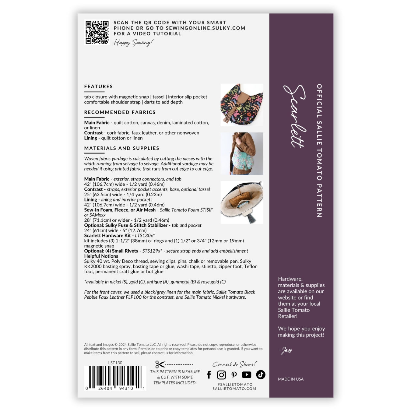 We are excited to collaborate with our friends at Sulky! The Scarlett Bag is a trendy, hobo style bag that is easy to sew! Jess designed this bag exclusively for Sulky of America. This bag features a tab closure with magnetic snap, tassel, interior slip pocket, comfortable shoulder strap, and darted bottom. The name of the pattern was inspired by one of my favorite classic movies, Gone with the Wind.
